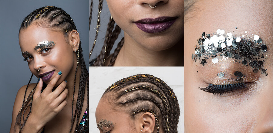 Our holiday and party season look is inspired by the Dark Wonder trend. Glitter and metallics are applied to eyes, brows and lips for a very glamorous winter look and the skin is illuminated. We see the return of cornrows and braids which continue to be a massive styling trend. Try working through strands of metallic threads through the plaits for an even more textured look.