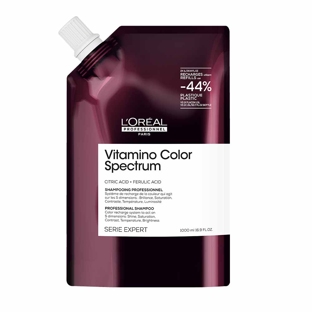 Vitamino Color Spectrum Professional shampoo by L’Oréal Professionnel, enriched with Ferulic Acid & Citric Acid. The system helps to lock dyes within the hair fibre using patented technology* to lock in your day 1 colour vibrancy for up to 100 days**. Proven Efficacy on the 5 colour dimensions***: