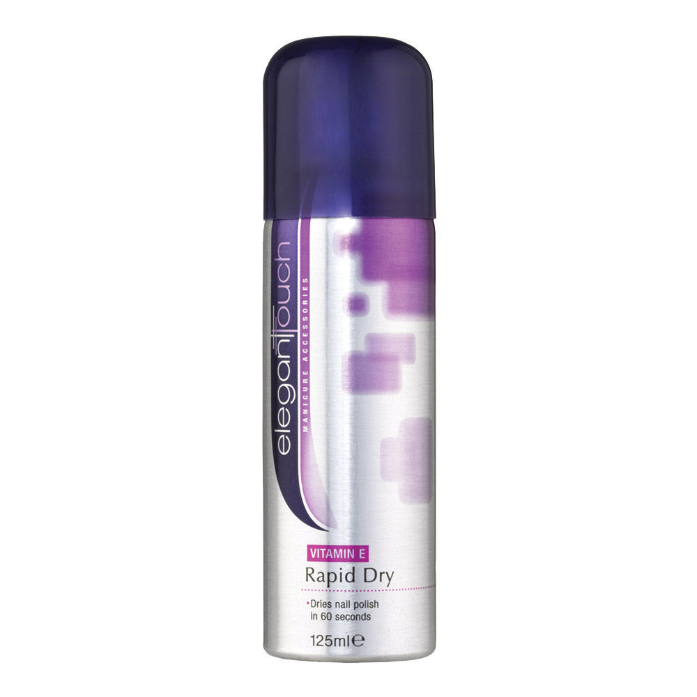Salon System Elegant Touch Rapid Dry Spray cures nails in 60 seconds. Ideal for applying to the nails after polish application. Contains vitamin E. No smudging. Available in a 125ml can.